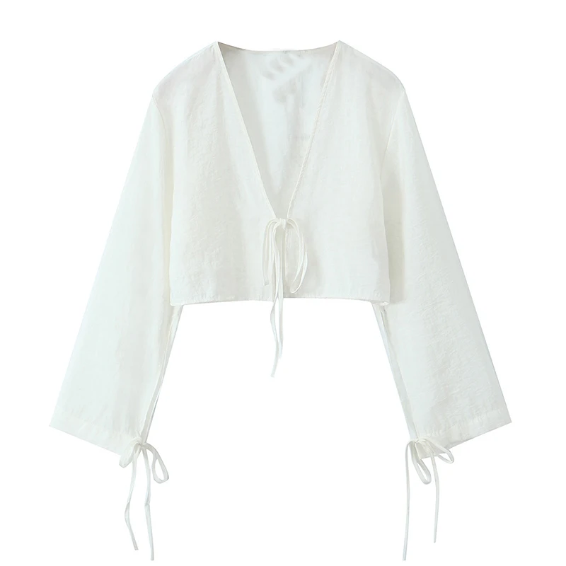 Embrace a stylish and laid-back vibe with our stunning V-neck long-sleeve cropped tie-top. Made from high-quality polyester, this top offers a comfortable fit that's perfect for both casual outings and relaxed days at home. The versatile design allows you to dress it up or down, making it a must-have addition to your wardrobe.