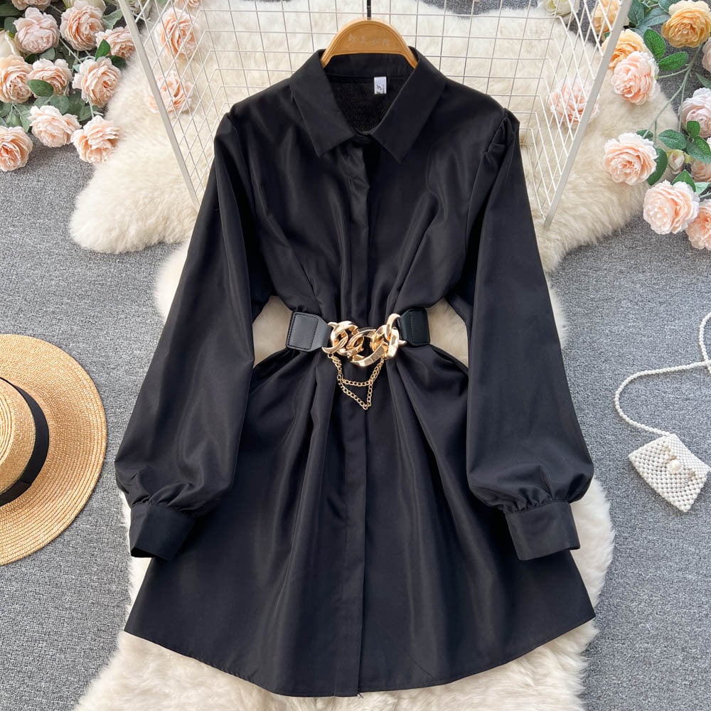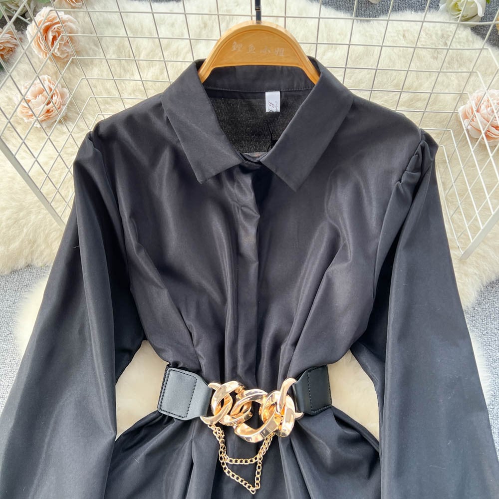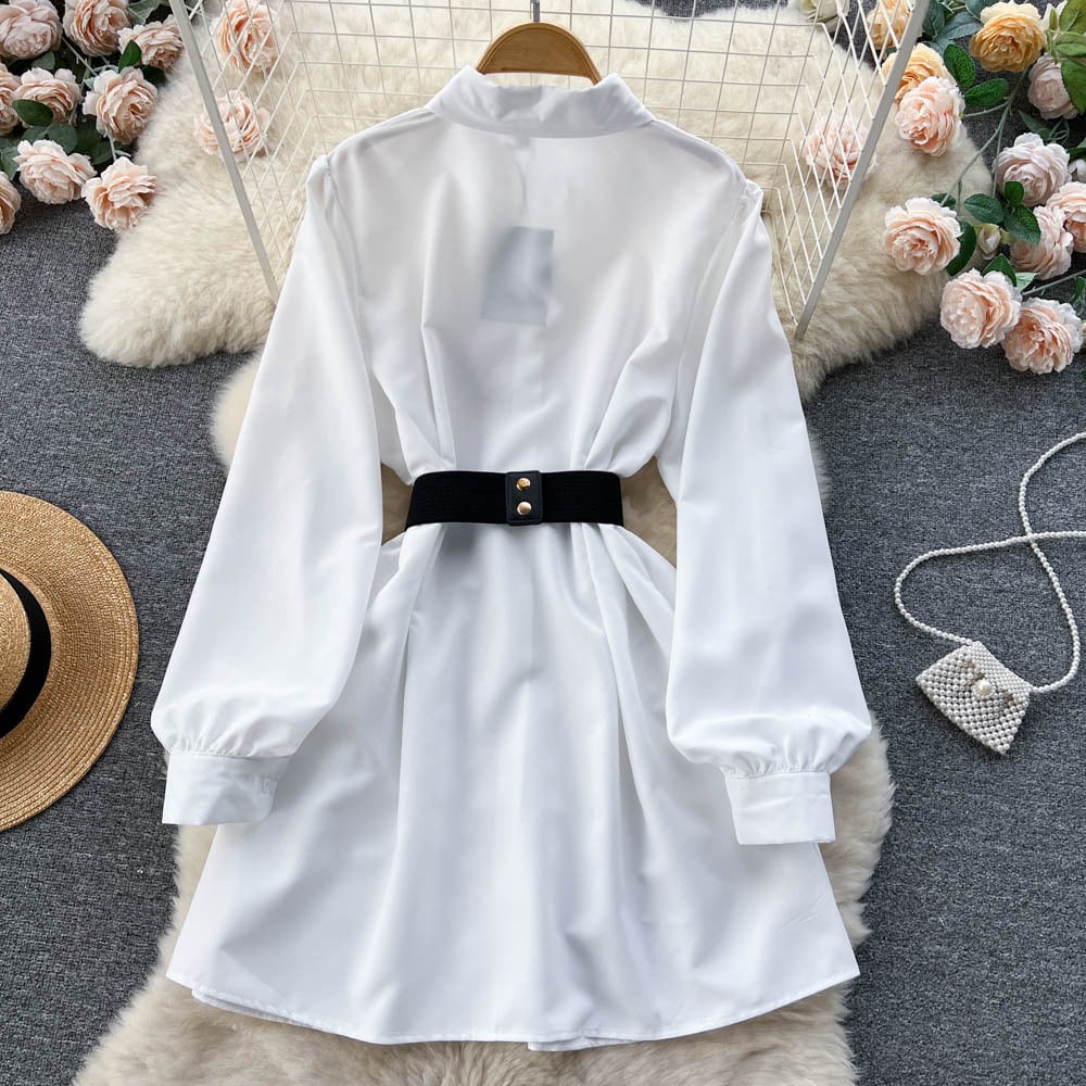 Discover the elegance of our Metal Buckle White Shirt Dress—a perfect blend of sophistication and comfort. Crafted from premium cashmere fabric, this dress features a stylish A-line skirt that flatters all body types. The long sleeves add a touch of refinement, making it ideal for both casual outings and formal events.